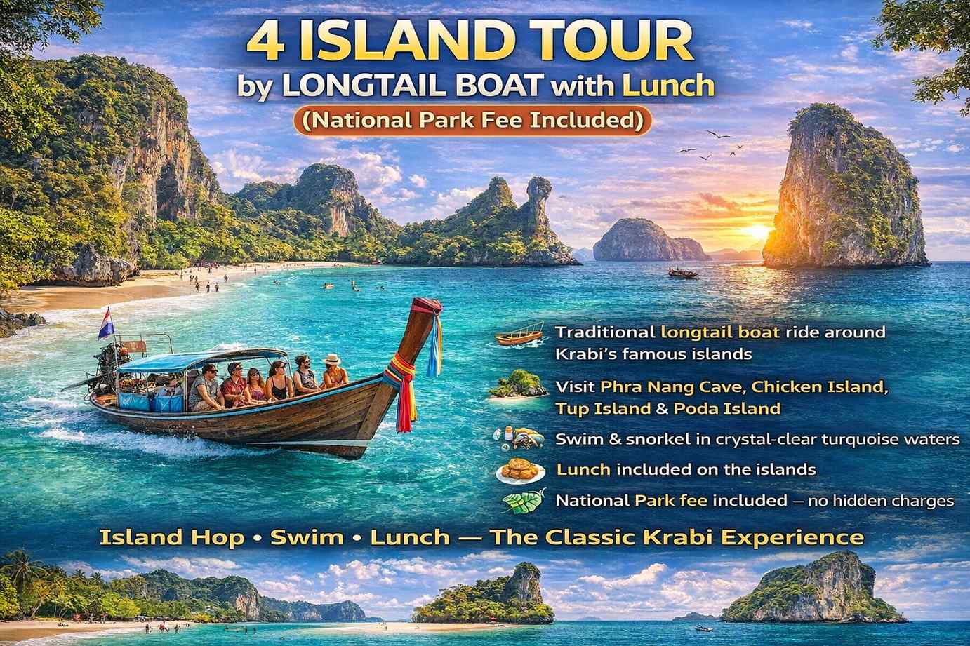 Description: Traditional longtail boat ride around Krabi’s famous islands Visit Phra Nang Cave, Chicken Island, Tup Island & Poda Island Swim & snorkel in crystal-clear turquoise waters Lunch included on the islands National Park fee included – no hidden charges